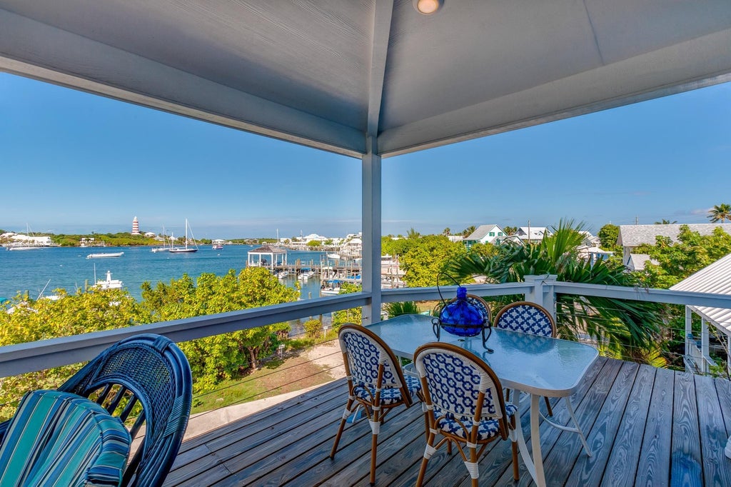 HOPE TOWN HARBOUR LOCATION with DOCK SLIP. Own one of the few harbourfront homes in the village with front row seats to the bustling harbour and only steps away from your own 27 ft dock slip. Beautifully elevated with the focal point of the home being a fabulous front deck overlooking the harbour and village. From sunrise to sunset, enjoy perfect panoramas of the lighthouse from the west side, and ocean views from the east. The tranquil white sand beaches of the Atlantic are only steps away. Newly renovated, it holds the perfect blend of modern living and island charm. A very comfortable home that compliments the genuine slow pace of island life. With 1356 sq. ft of finished floor space, the main floor features an open concept living and dining area, cozy family room, and charming eat-in kitchen. Modern stainless appliances, gas range, new cabinetry and butler’s pantry off the kitchen. Expansive glass doors open to the covered deck that offer extraordinary space for seamless indoor to outdoor living. The 2 bedroom suites upstairs each have ensuites and more incredible views. Turnkey.