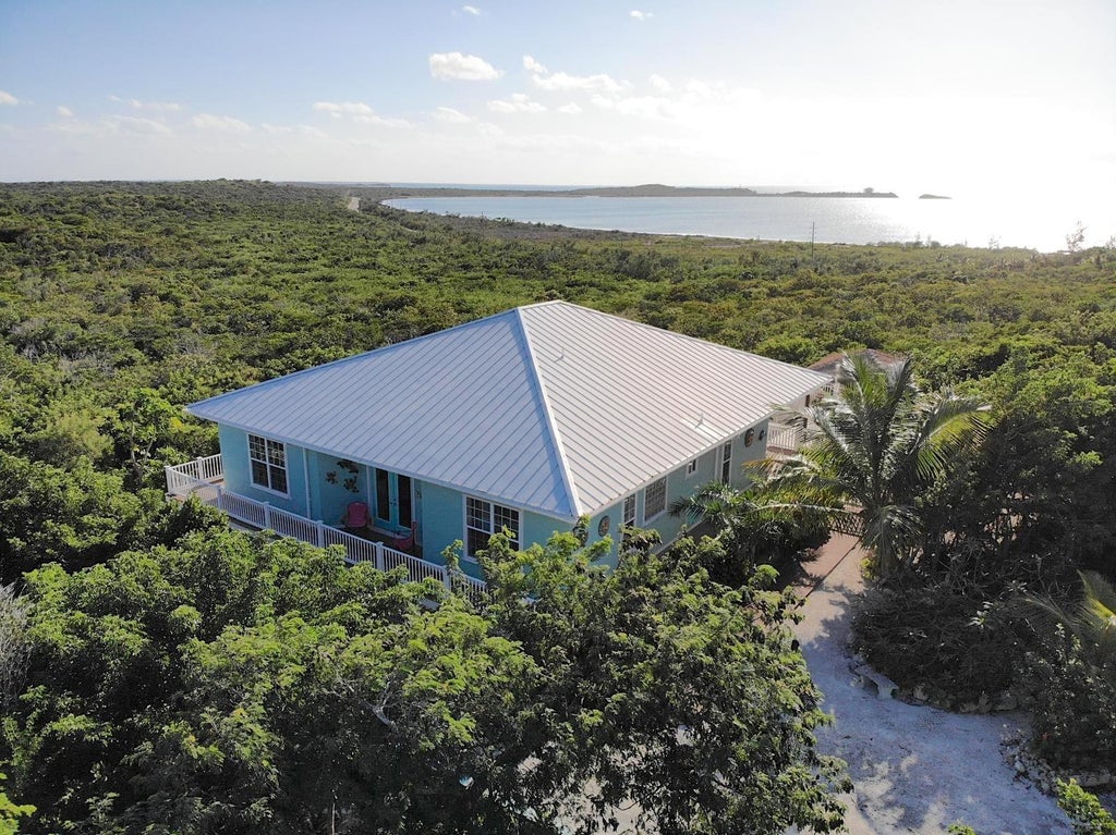 Enjoy panoramic harbor and island views from this home perched on an elevated lot. The community beach is just a short walk away. 3 bdrms/2 baths with screened Lanai and covered verandah. The primary bedroom has an ensuite and large walk-in closet. The interior features 10ft ceilings in the bedrooms/kitchen and 22 ft. ceiling in the living area. The verandah flows into the outdoor entertainment area featuring a tiki-style hut with comfy seating and a Bahamian made rock fireplace. The perfect spot for gatherings of friends and family. The home sits on a half-acre lot with lush landscaping, including a large variety of orchids. Short drive to grocery, gas station, boat ramp, Atlantic Ocean beaches, Farmer's Market and other businesses. A 20-minute drive to Deadman's Cay airport. Other features: 20K gal. cistern + 3 additional 1500 gal. water tanks. 5 ton Trane Central Air Condition. 600 Sq. Ft. Basement/Bunker. Hurricane Shutters. 20KWBack Up Generator. Phone and internet. Shades in all windows/doors and on West side of Deck.